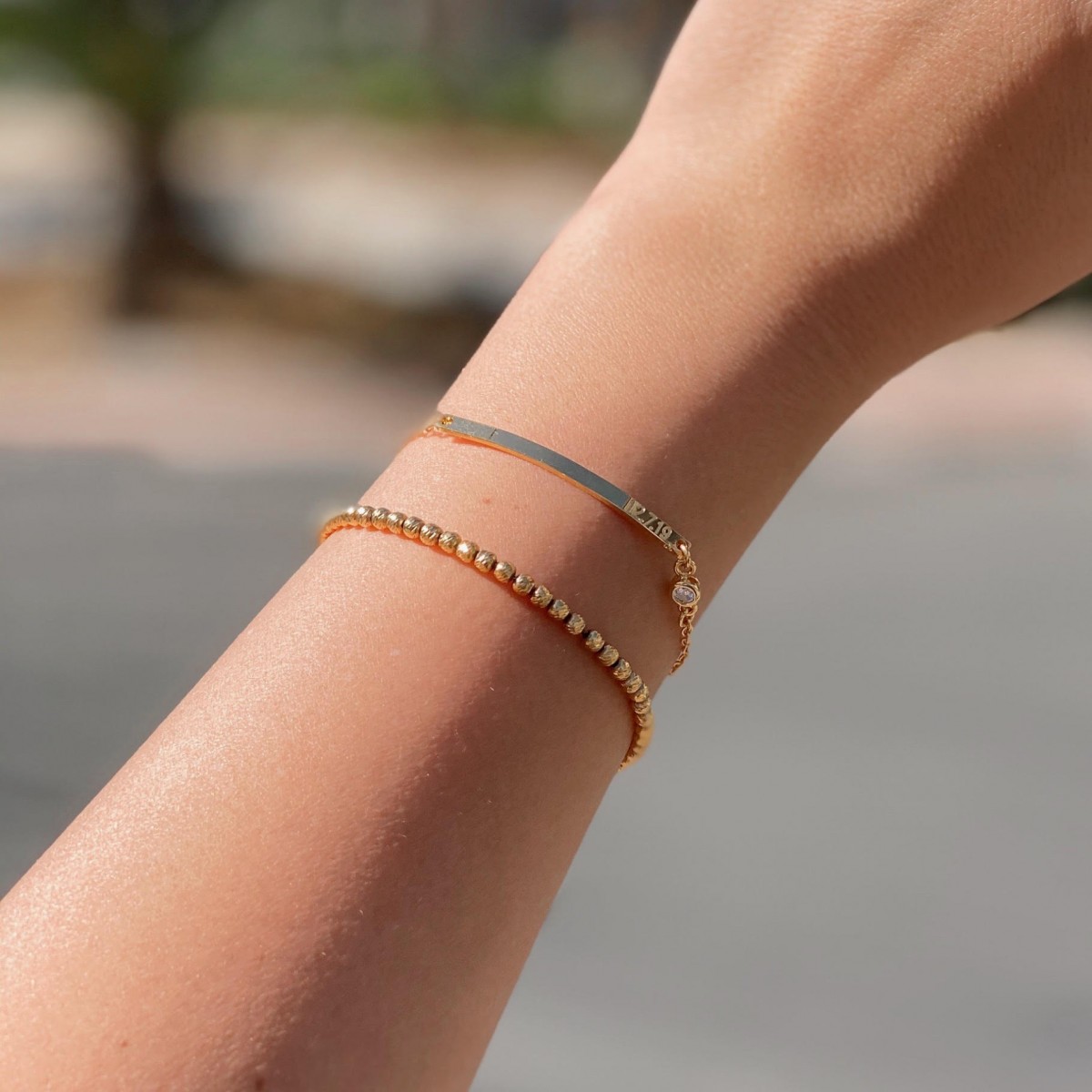 צמיד עדין בשילוב פלטה פס דקה עם חריטה אישית ואבן זירקון.